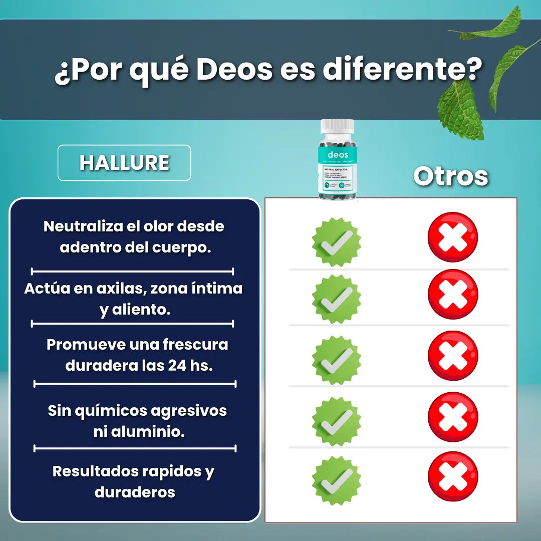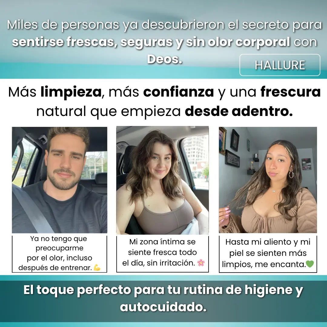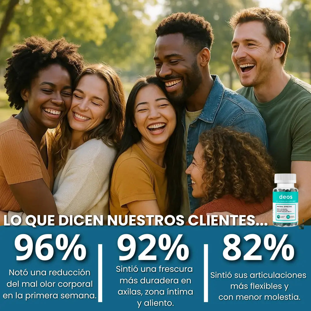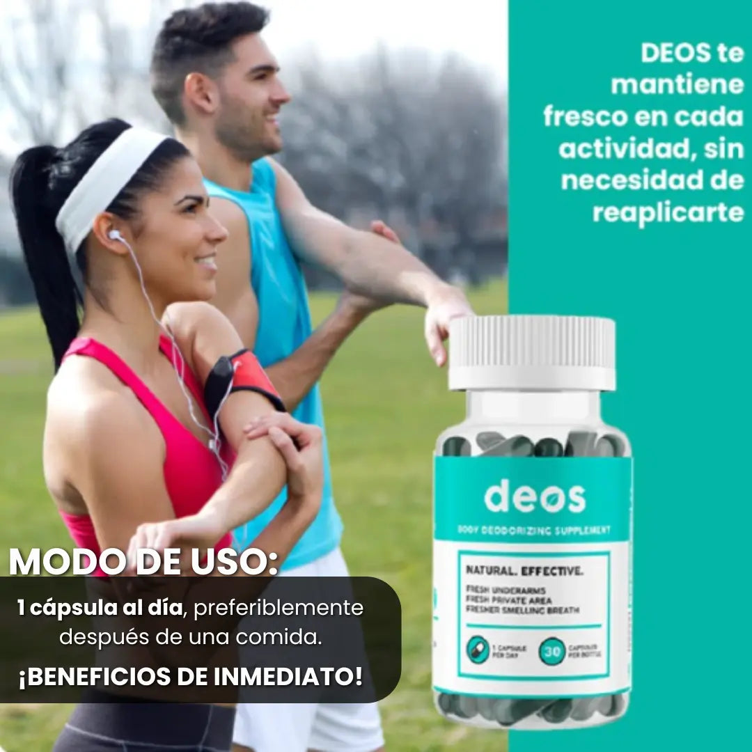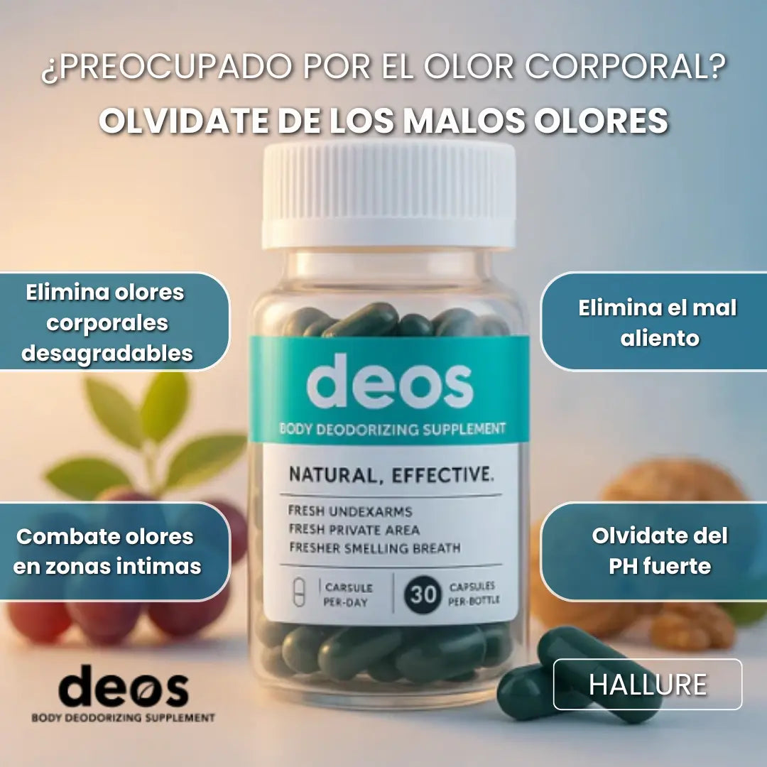 Deos es un suplemento natural diseñado para neutralizar el olor corporal desde adentro, ayudándote a mantener una frescura duradera y una sensación de limpieza total en todo tu cuerpo.