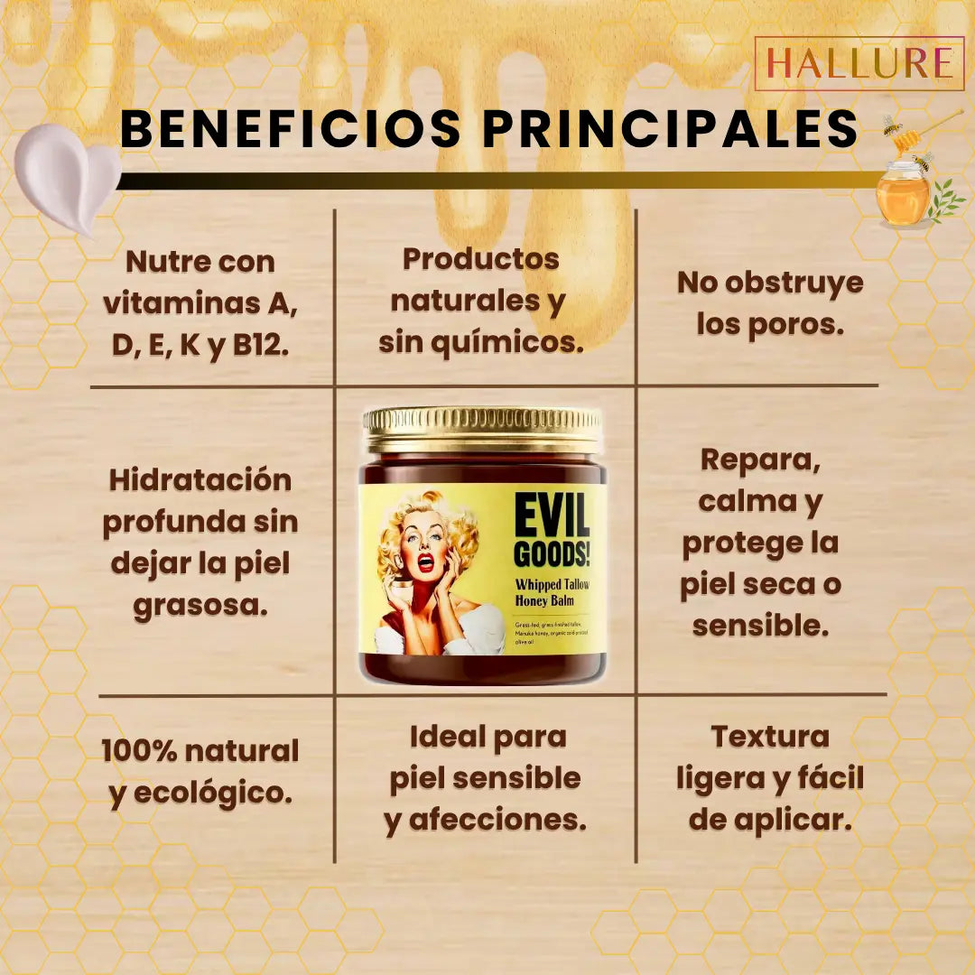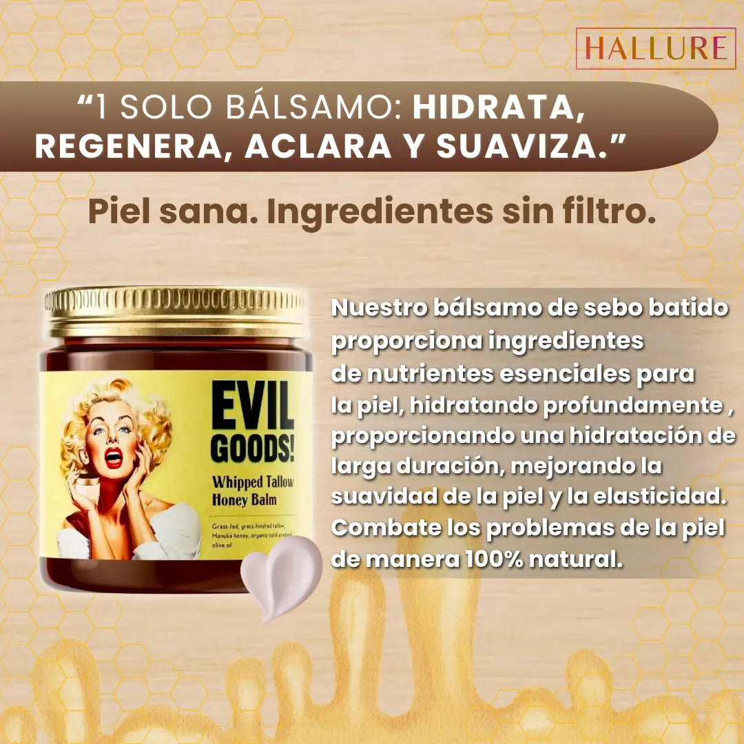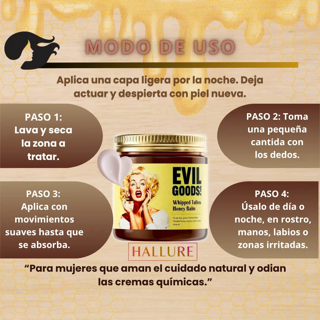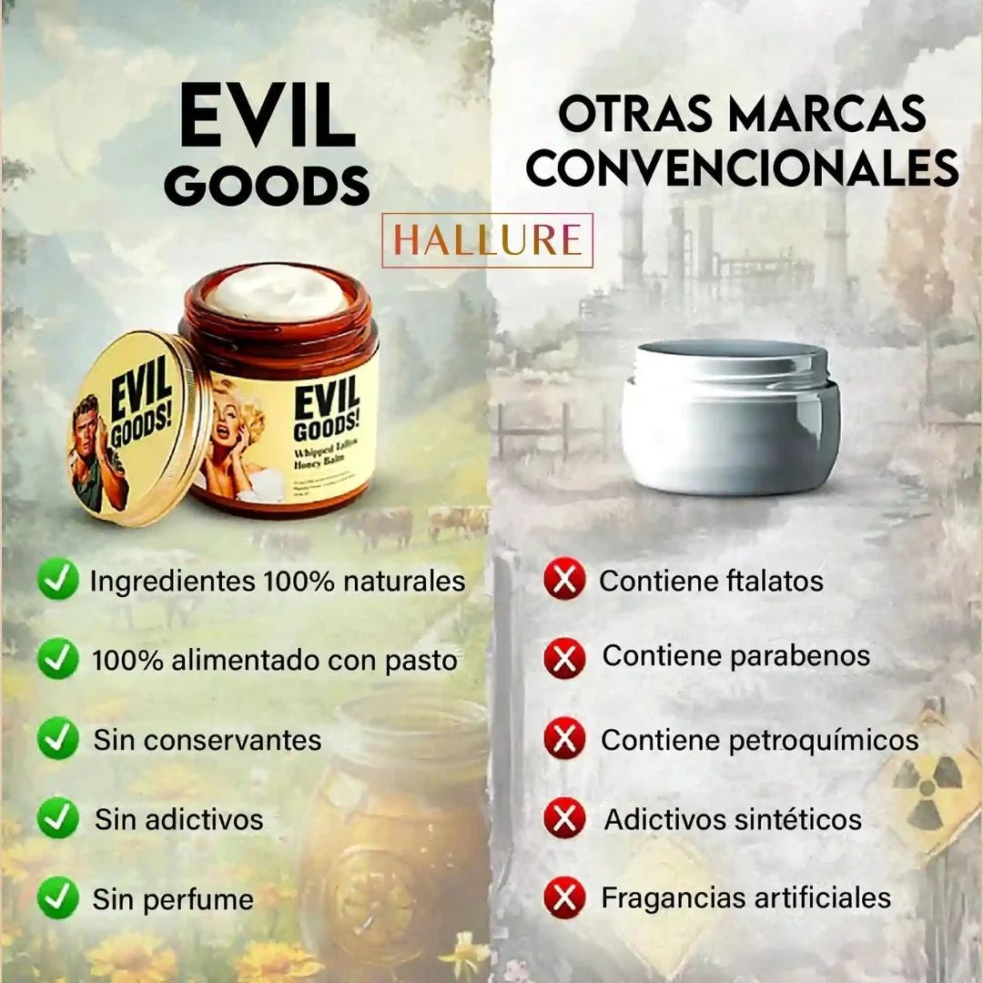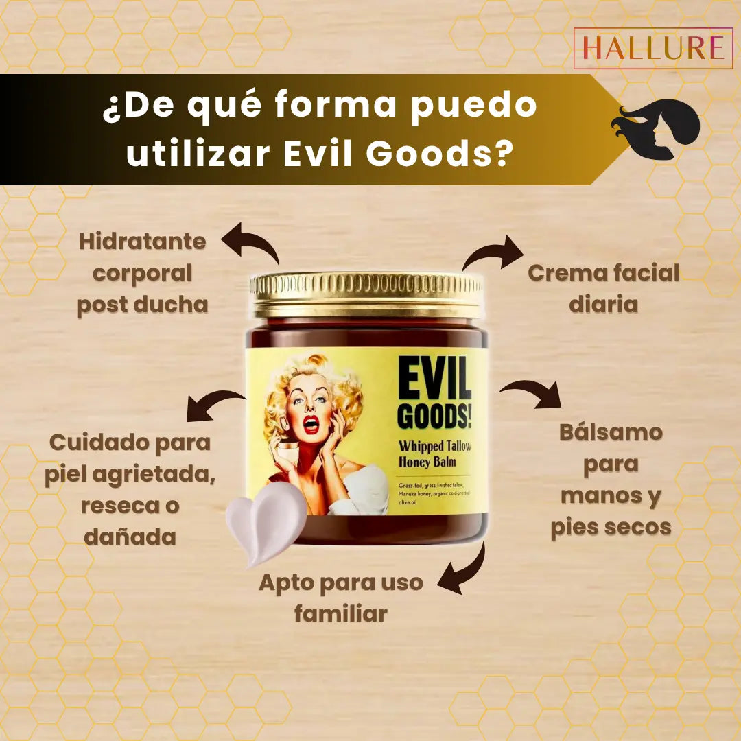 Evil Goods es un bálsamo regenerador hecho con sebo batido y miel pura. Repara grietas, suaviza zonas ásperas y calma irritaciones sin químicos agresivos. Ideal para pieles sensibles, resecas o con tendencia a la descamación.