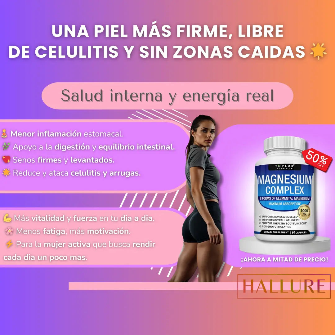 Es un suplemento diseñado para mejorar la firmeza de la piel, reducir la celulitis y aportar energía diaria. Combina magnesio y colágeno para actuar desde dentro y potenciar tu belleza natural.