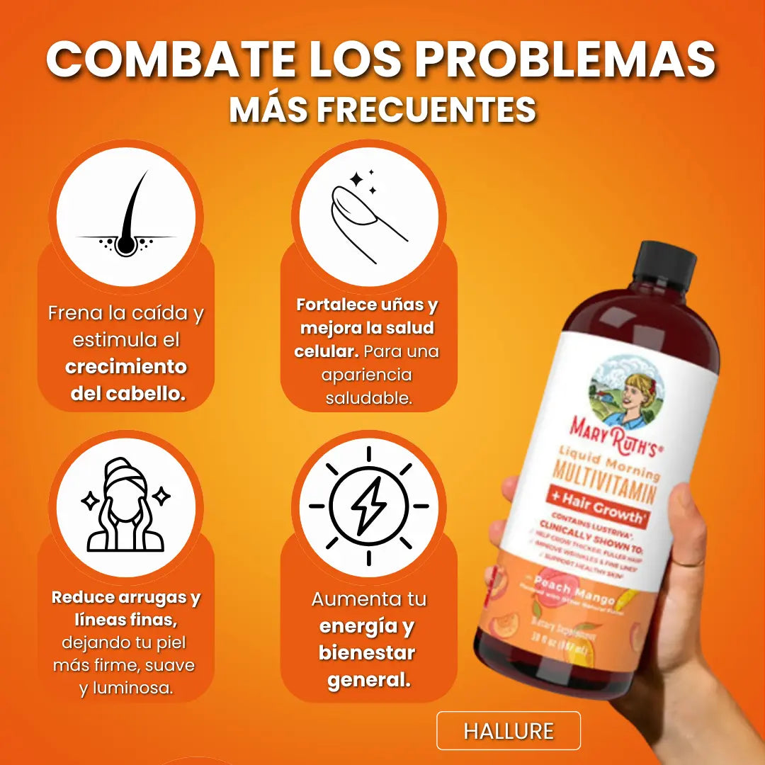 Es un multivitamínico líquido avanzado, diseñado para fortalecer, nutrir y revitalizar el cabello, la piel y las uñas desde el interior.