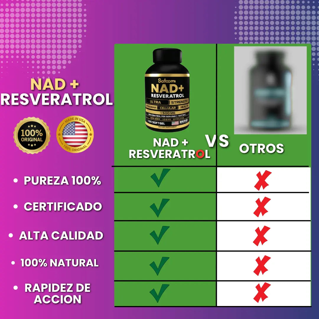El NAD+ es esencial para la producción de energía en las células y la reparación del ADN, mientras que el Resveratrol protege contra el estrés oxidativo y promueve la longevidad.