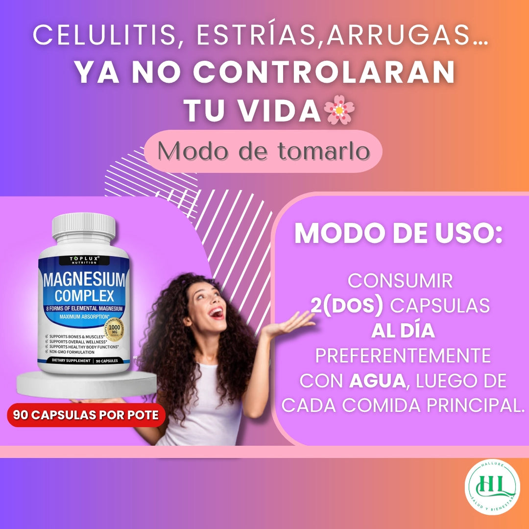 Es un suplemento diseñado para mejorar la firmeza de la piel, reducir la celulitis y aportar energía diaria. Combina magnesio y colágeno para actuar desde dentro y potenciar tu belleza natural.