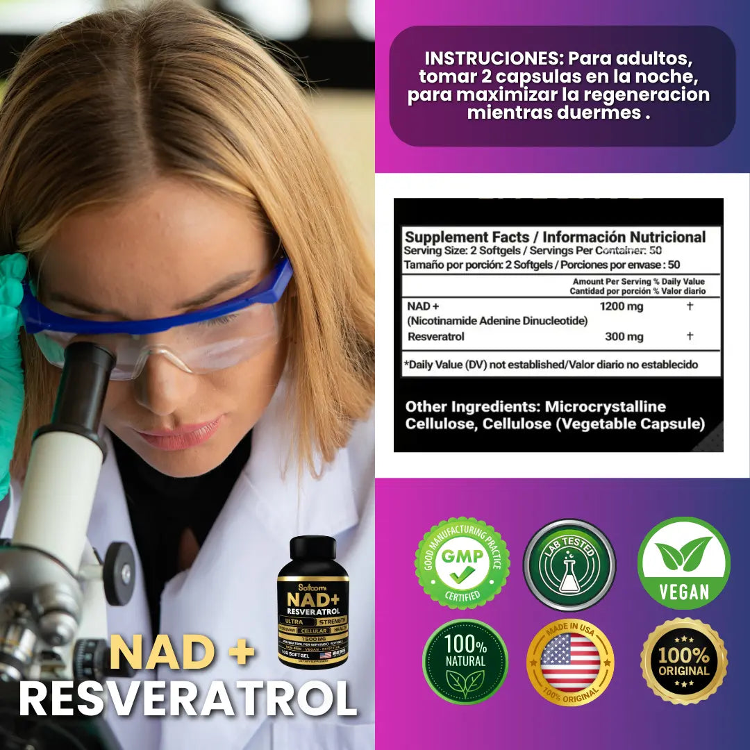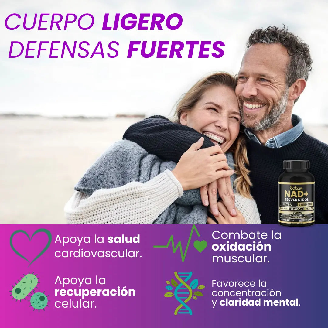 El NAD+ es esencial para la producción de energía en las células y la reparación del ADN, mientras que el Resveratrol protege contra el estrés oxidativo y promueve la longevidad.